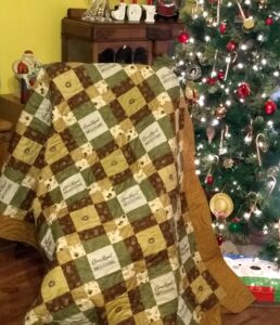 I just finished all of the Christmas t-shirt quilts for customers! I usually try to get done before the 20th and I cut it close this year. I also did several Crown Royal quilts that people ordered for Christmas gifts this year. One customer brought me a new kind of Crown Royal bag that I had not seen before and I didn’t think my usual purple and gold would work real well, so I tried something different. I’m really pleased with the way it turned out and the customer was thrilled. I hope the recipient likes it as much as we do. Since I’m pretty sure the recipient won’t be reading my blog, I’m going to go ahead and share a picture.