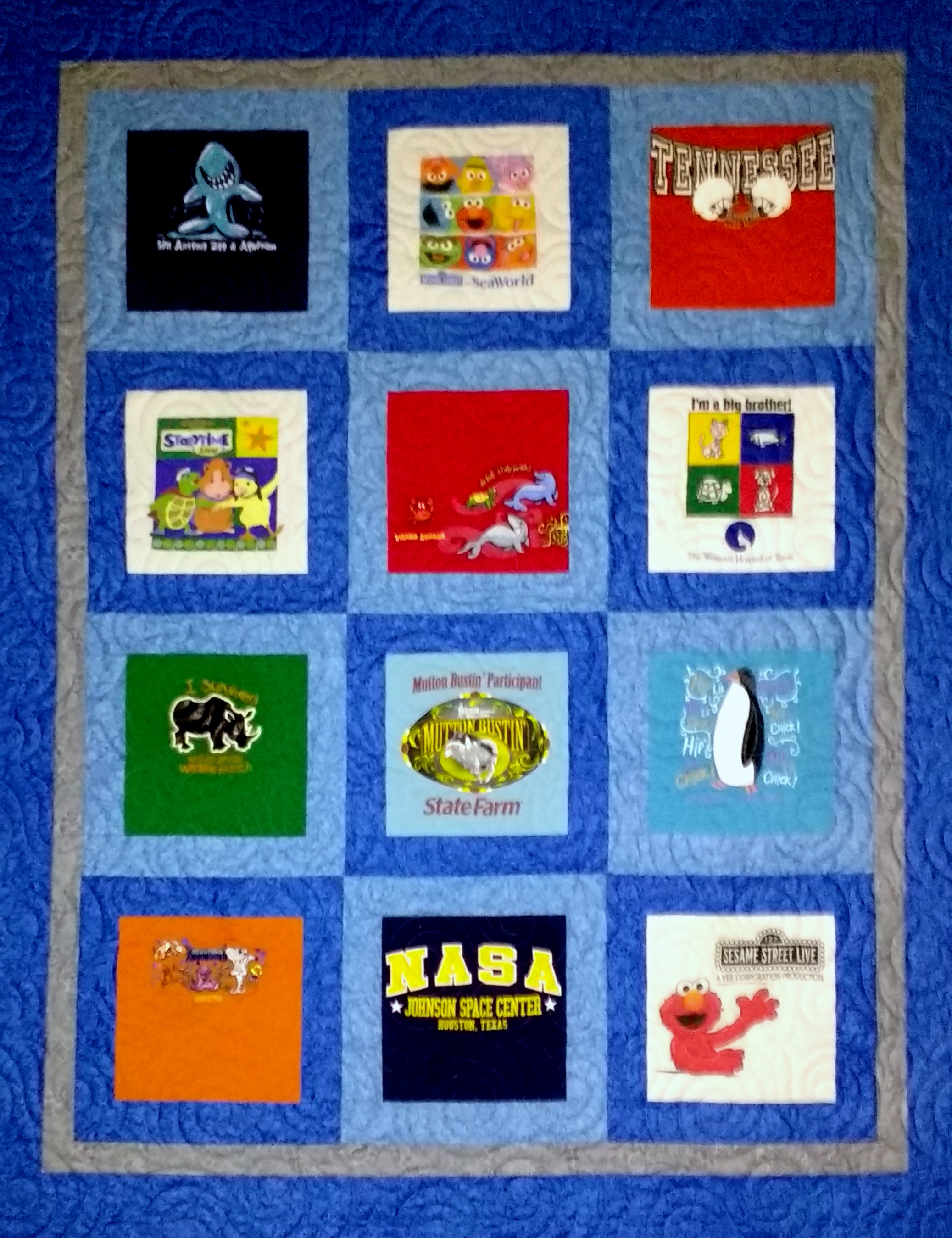 know how moms are about spending on themselves, but a thoughtful husband and father took care of that for his wife for Mother’s Day this year and had a quilt made with his son’s small t-shirts. I realize it’s too late to have a quilt made for Mother’s Day this year, but how about for her birthday or Christmas? Or you can always have one done and save it for next Mother’s Day. I can assure you that she will be thrilled with you and with the quilt. She’ll love snuggling under it and reliving the early years of her child’s life.