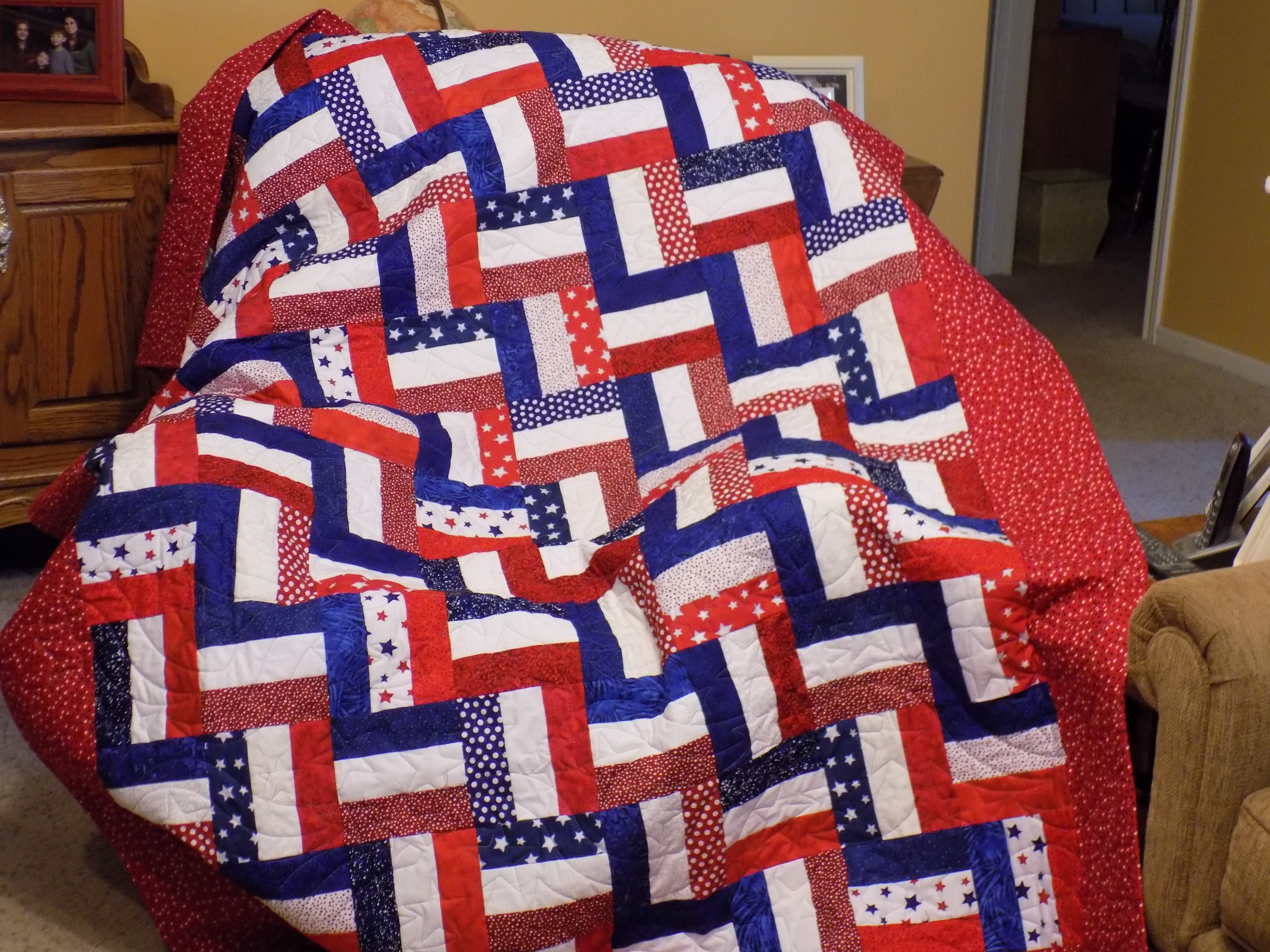 Quilters are caring, giving people. We love to make quilts and we love to give them to others, especially in a time of need. Quilters tend to think that a quilt will always make somebody feel better. I made quilts for my sister and my sister-in-law when they were undergoing treatment for breast cancer. I recently sent a quilt to a friend in Georgia who is currently on chemo and radiation. The recipients always seem appreciative and I hope they realize how much love and comfort I am trying to convey to them. Quilters have been making and donating to Quilts of Valor for several years and thousands have been given to our military men and women who are currently serving or have served our county in the past. Recently, a quilting friend of mine started Quilts for Camp Hope. Camp Hope is a treatment center for returning soldiers who are battling Post Traumatic Stress Disorder. Here is a photo of the one I made to donate to Quilts for Camp Hope. I plan to make more or at least do the quilting on more quilt tops for this worthy cause.