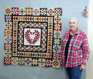 Shirley had given us the center medallion a couple of months ago and asked us to complete it for her. Each of us took a turn at adding pieced borders to the quilt and she did not see it until it was completed. Shirley was absolutely thrilled with the result and we were pretty pleased with ourselves, especially when the retreat owner asked if there was a pattern available.
