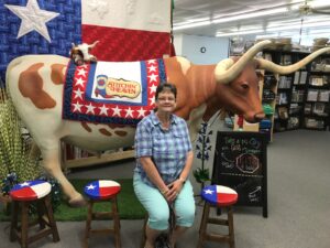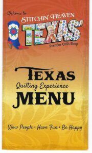 opportunity to visit Stitchin’ Heaven, which is a well-known quilt shop in Mineola, Texas. They had a very fun booth at the Houston International Quilt Festival this past year and I’ve been wanting to visit the shop long before that. Unfortunately, my time was limited since I was supposed to be celebrating Easter with family, but my sisters and my mother went with me, so I figure that counts. The staff at Stitchin’ Heaven is very friendly and greeted us at the door with a brochure and then took us around to show us the different areas of the shop. It is a large shop with an equally large selection of quilting fabric, pre-cuts, notions, patterns and books. They also sponsor quilt cruises and motorcoach trips and they have a retreat facility as well. And they have an almost life-sized longhorn named Gus, so I had to get my picture with him. They even offer complimentary beverages including wine! So if you ever get a chance, stop in and plan to stay a while. You’ll be glad you visited this quilter’s paradise.